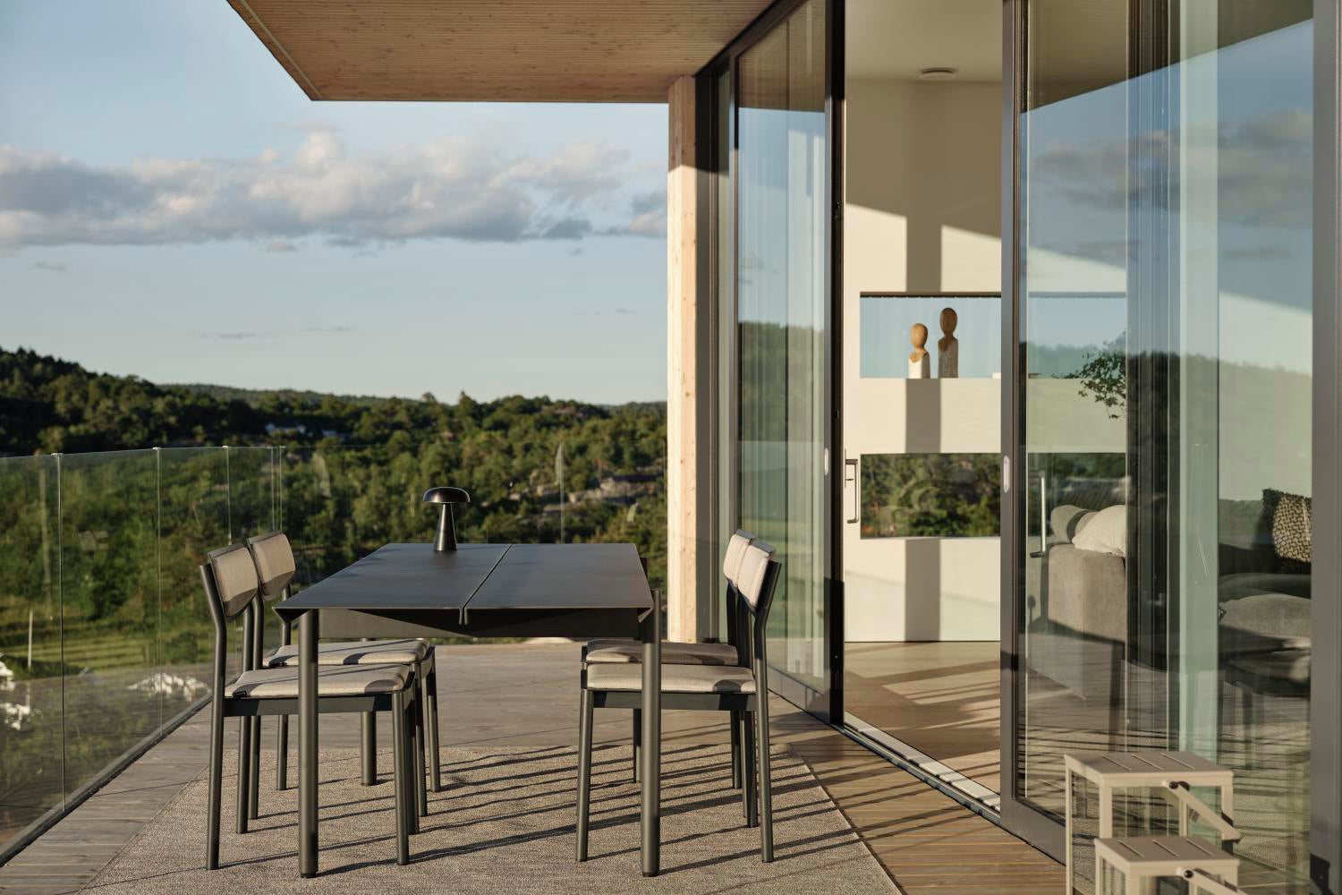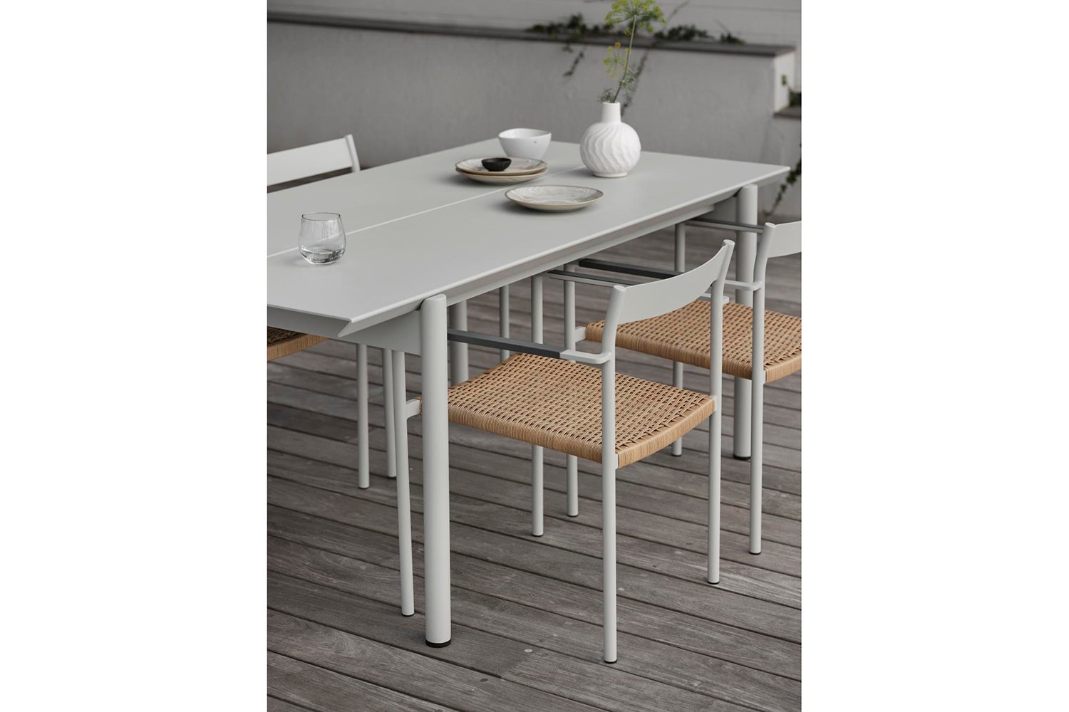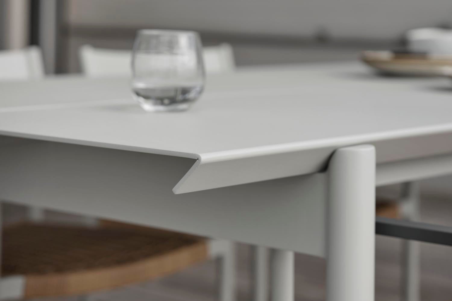 Completely in aluminium, the table B45 gives a modern feel, austere but at the same time inviting and with room for many. Thanks to sound-absorbing paint on the underside of the table, the clatter from glass and porcelain is dampened. B45 is available in two lengths (180 and 250 centimeters respectively), where a design detail is that the distance between the table legs is the same. The edges of the tabletop have an elegant 45-degree angle, a detail that catches the eye. Available in two colors.
