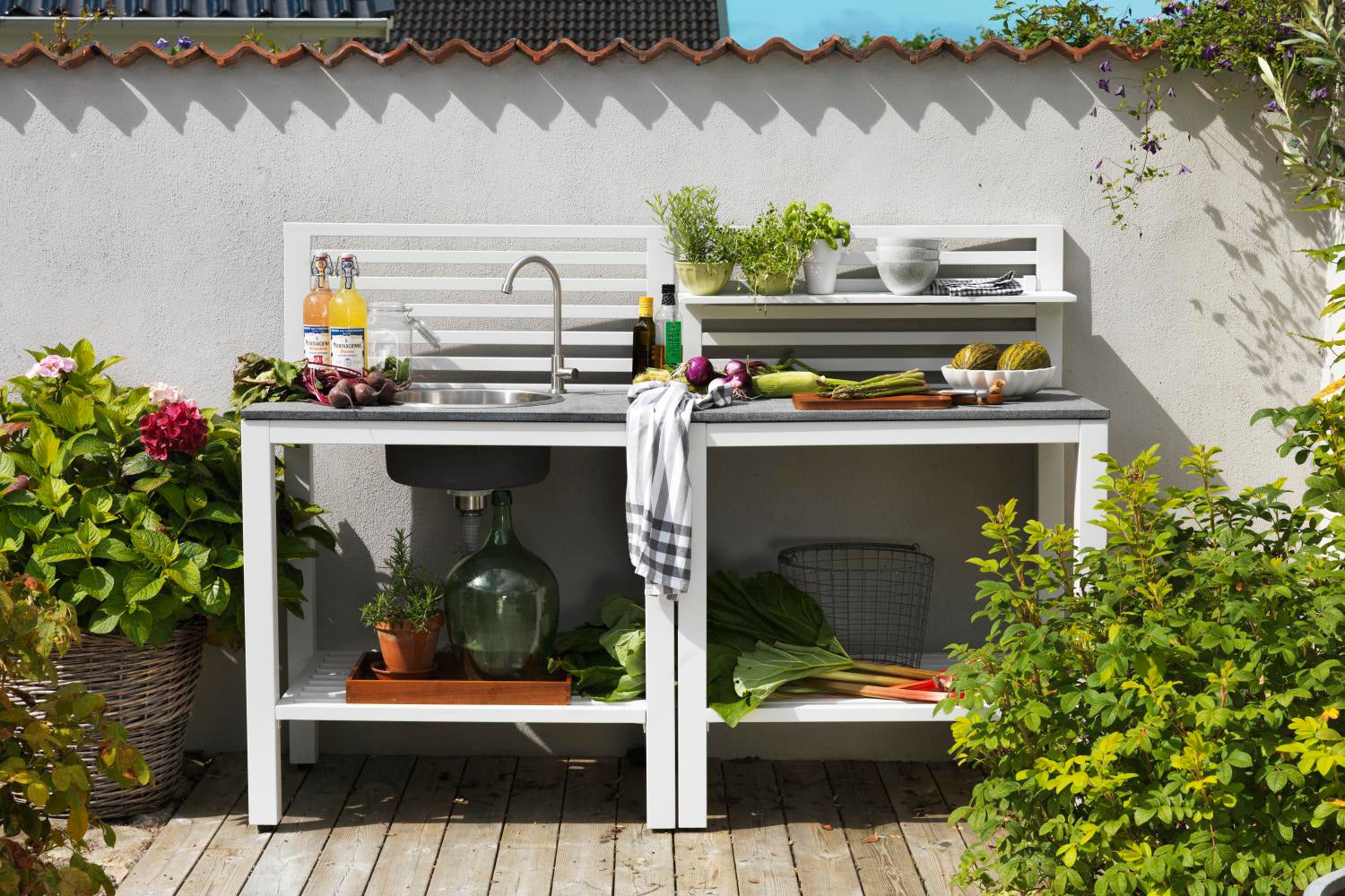 Bring your friends to the patio and prepare and cook the food on the spot! Bellac outdoor kitchen in matt lacquered aluminum, stone top, tap and sink makes it possible! Available in white, black and anthracite.