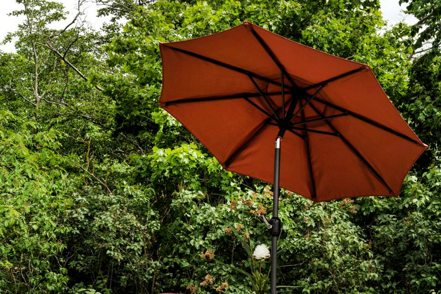 Sunshade umbrella with two-section aluminium shaft and eight steel ribs. 200 g polyester fabric with ventilation flap. Crank-function.