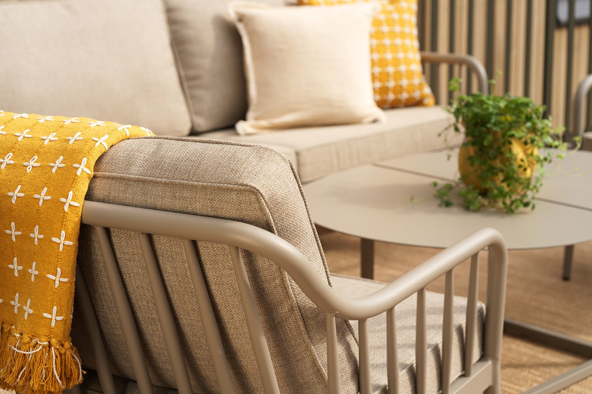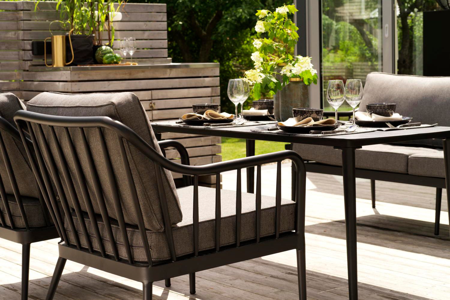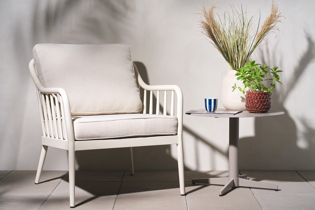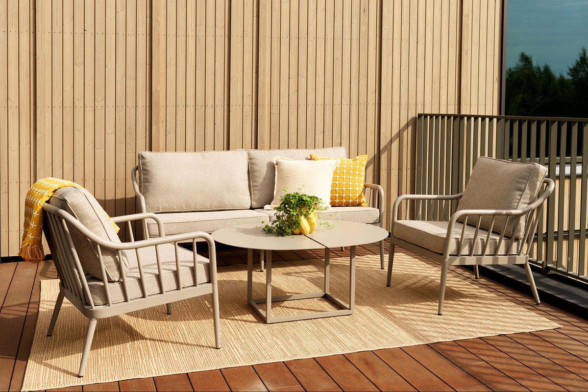 Soft shape meets clean lines in a mix of classic and modern. Made of round aluminium profile with a matte finish, which provides both durability and elegance. Soft cushions in recycled polyester add comfort and durability.