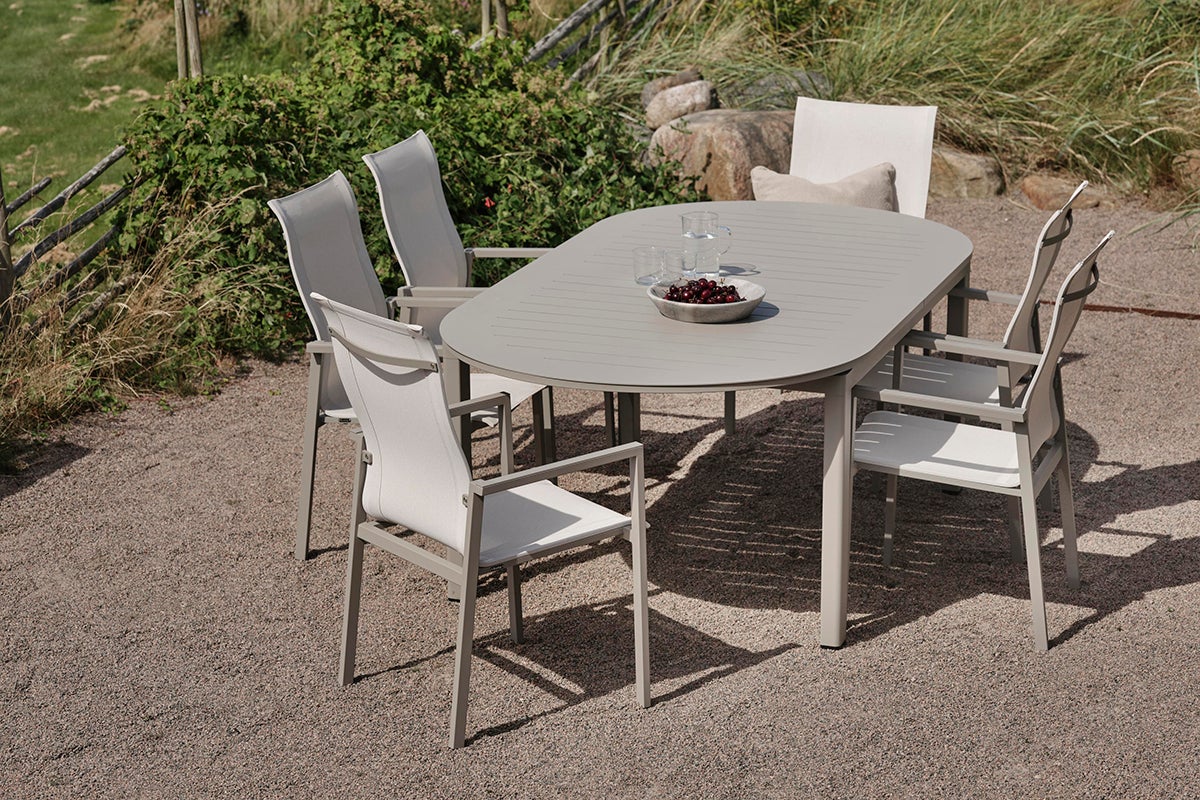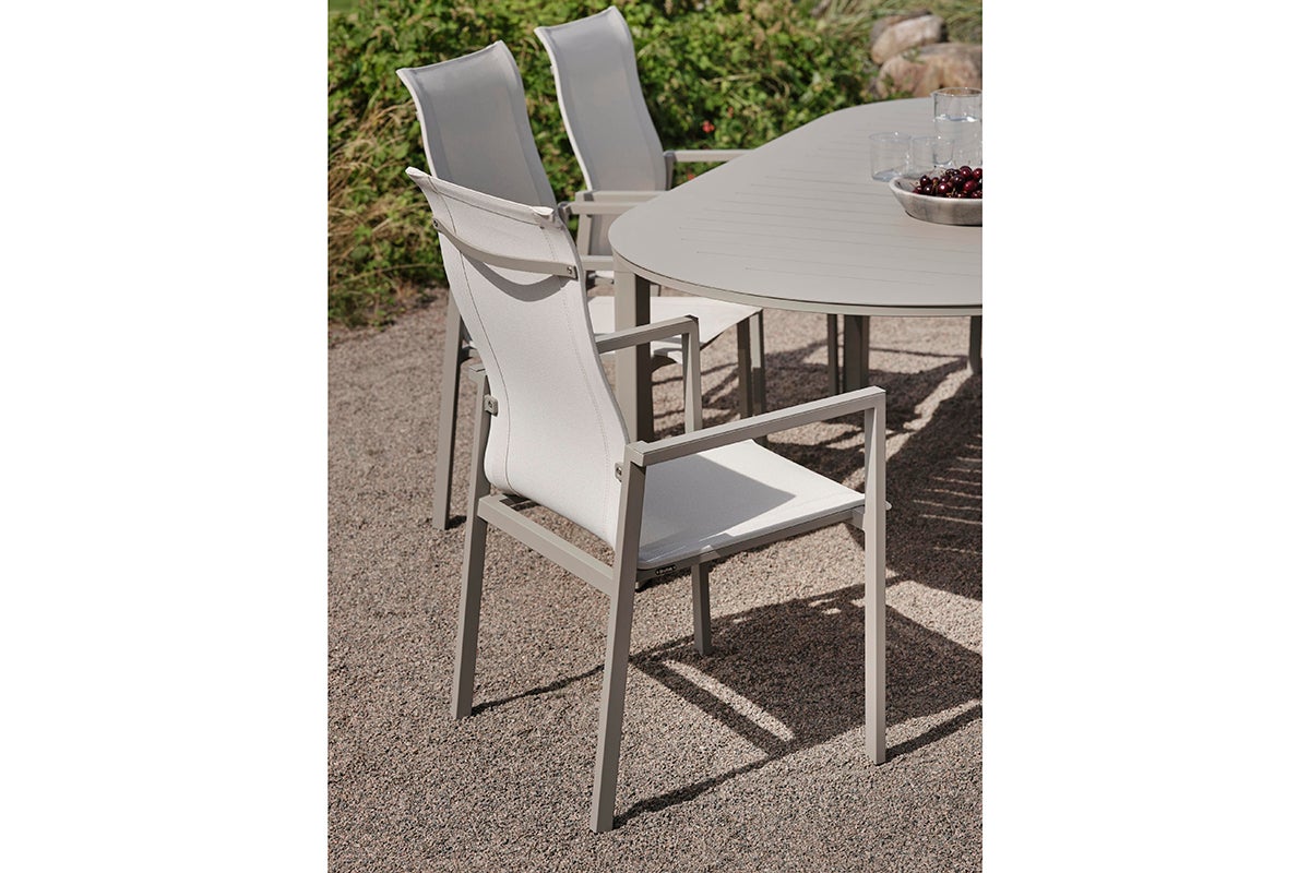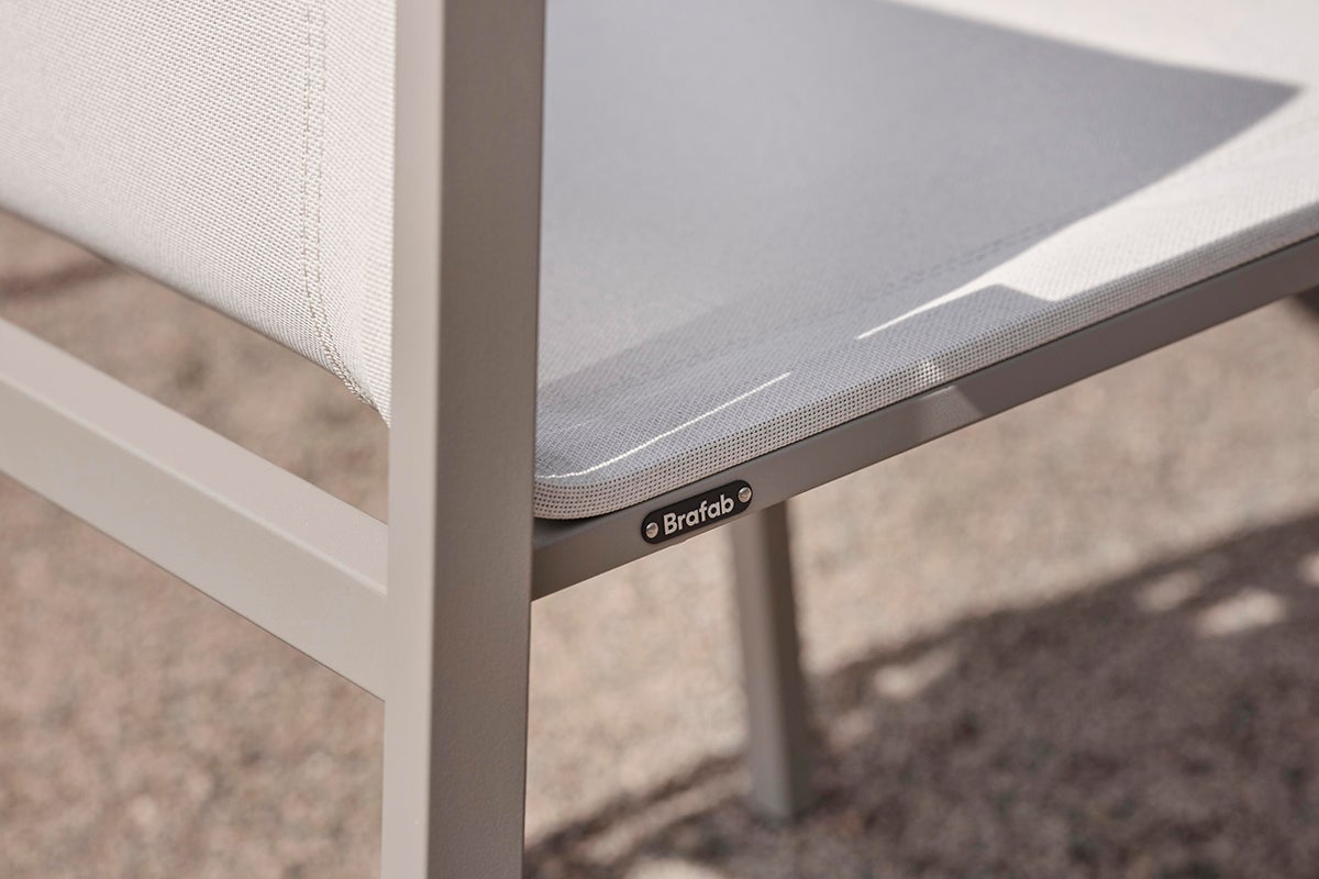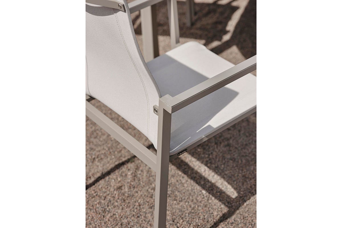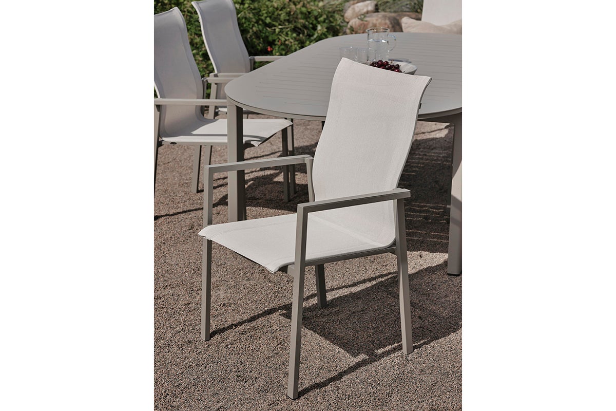This stylish and comfortable dining chair features small details that give it a modern edge while maintaining a timeless appeal. The high back textilene seat ofers extra comfort with its ergonomic design, contouring to your spine and encouraging you to sit and relax for extended periods. For an added touch of comfort, pair it with a Frisk seat cushion.