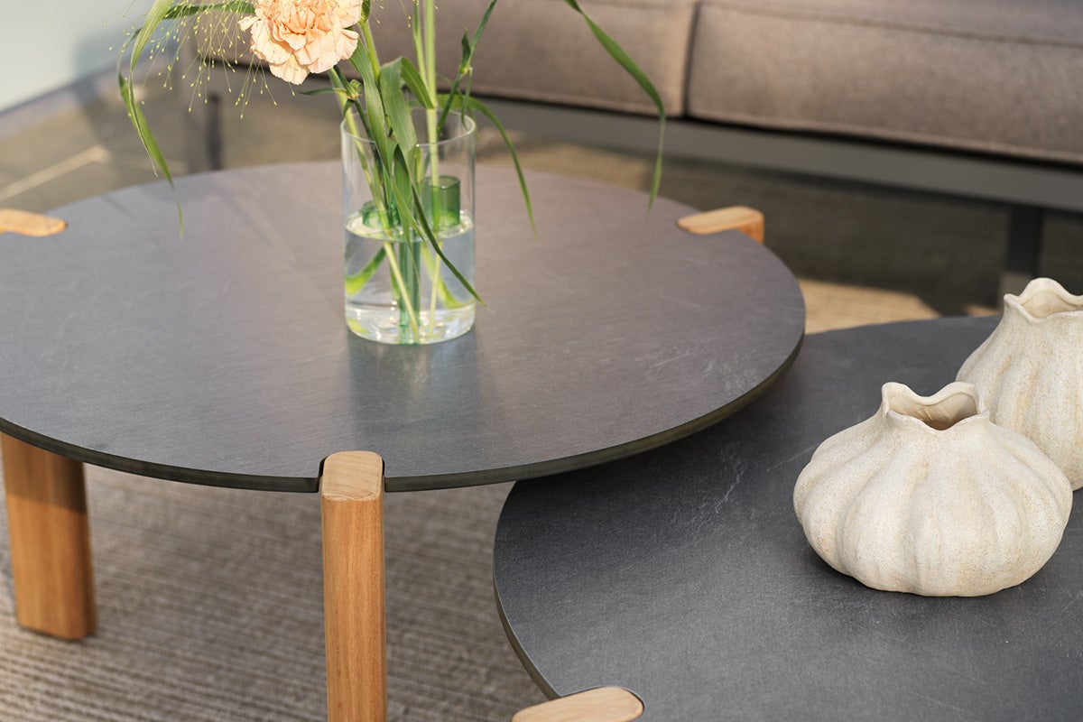 Coffee tables in two diferent heights enhance both the enjoyment and practicality of your outdoor space. The Domino tables add an extra touch of elegance and top-quality materials to the mix, featuring sturdy teak legs and a durable laminate top.