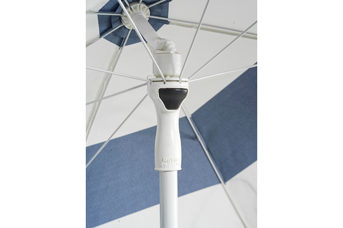 Head to the beach in style with the Follina parasol, combining class and functionality. It features a push-up opening mechanism with an easy twist-and-turn tilt function. Choose between a lively pattern or a classic plain blue fabric. Available in two sizes.