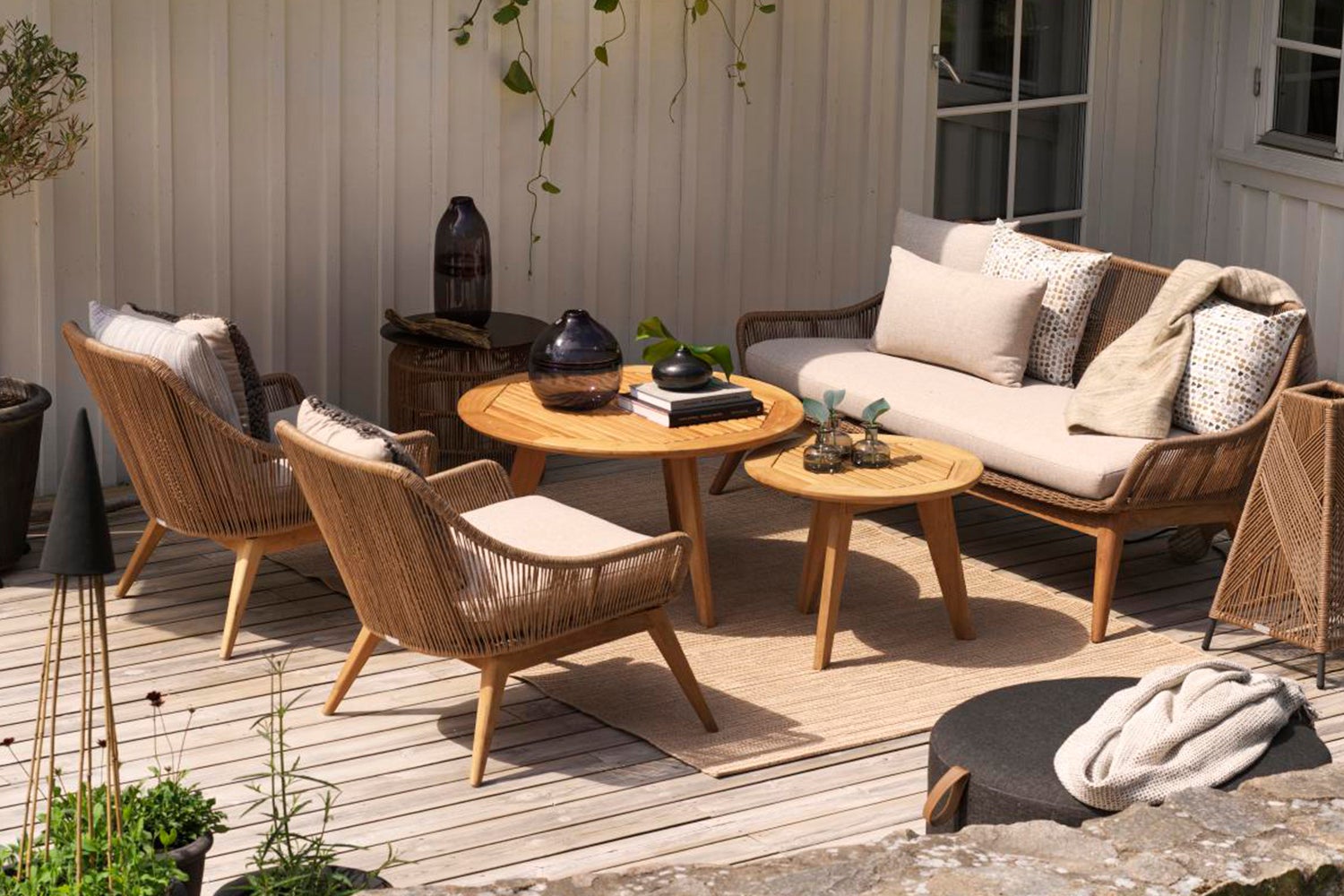 Timeless design with a warm and welcoming look. Decoratively braided and classic frame of teak. Seat cushions are included. Flexible in style; use your own back cushions and change style and design whenever you want.
