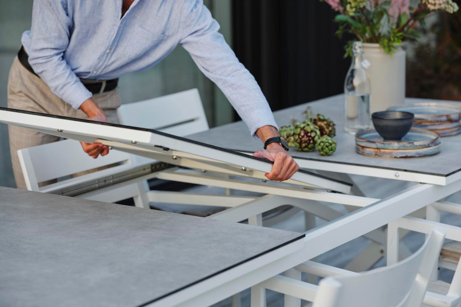 Time to gather together family and friends for a fantastic party? Then the Hillmond extendible table is the perfect choice. Choose between our longest table, with room for at least 12 people, or the shorter version, which accommodates 8–10. The underframe is in lacquered aluminium and the top can be either transverse aluminium ribs with an embossed wooden pattern or one of our wood-patterned laminate tops.