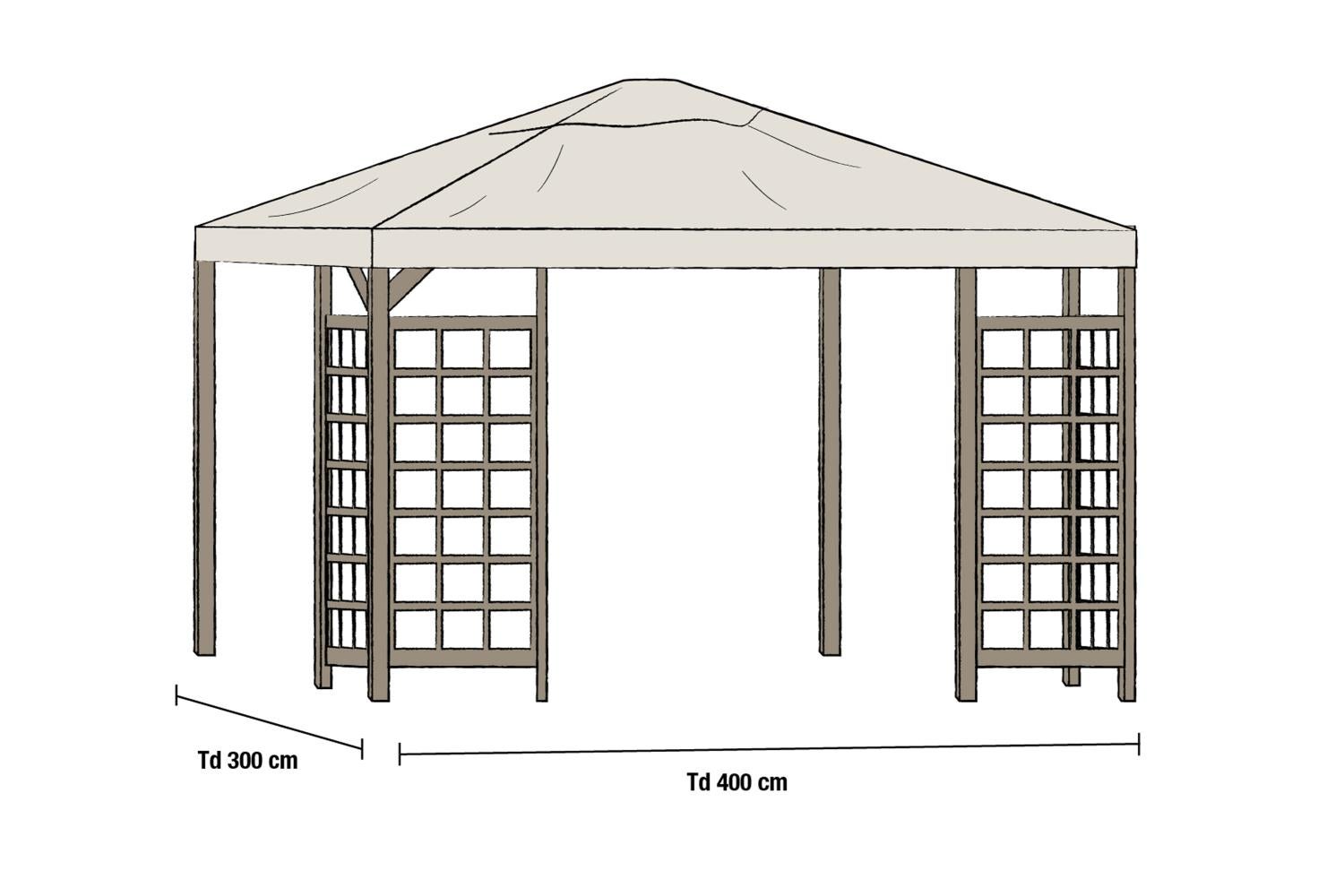 Practical aluminium gazebo that provides excellent shade from the sun or protection against rain, wind and annoying insects through addition of side walls or a mosquito net. A sturdy pine stand supports the rainproof frame, which comes in different colours. The wood sections are lacquered and come in different colours. The frame, walls and trellises are sold separately.