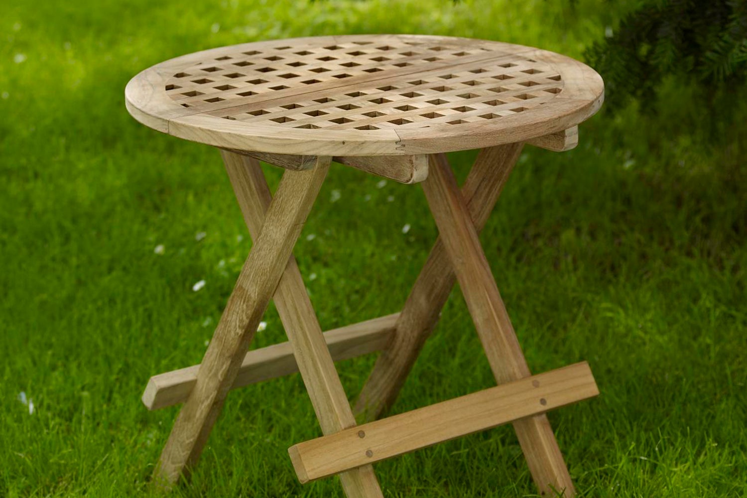 A well-placed folding side table in teak. Basic teak.