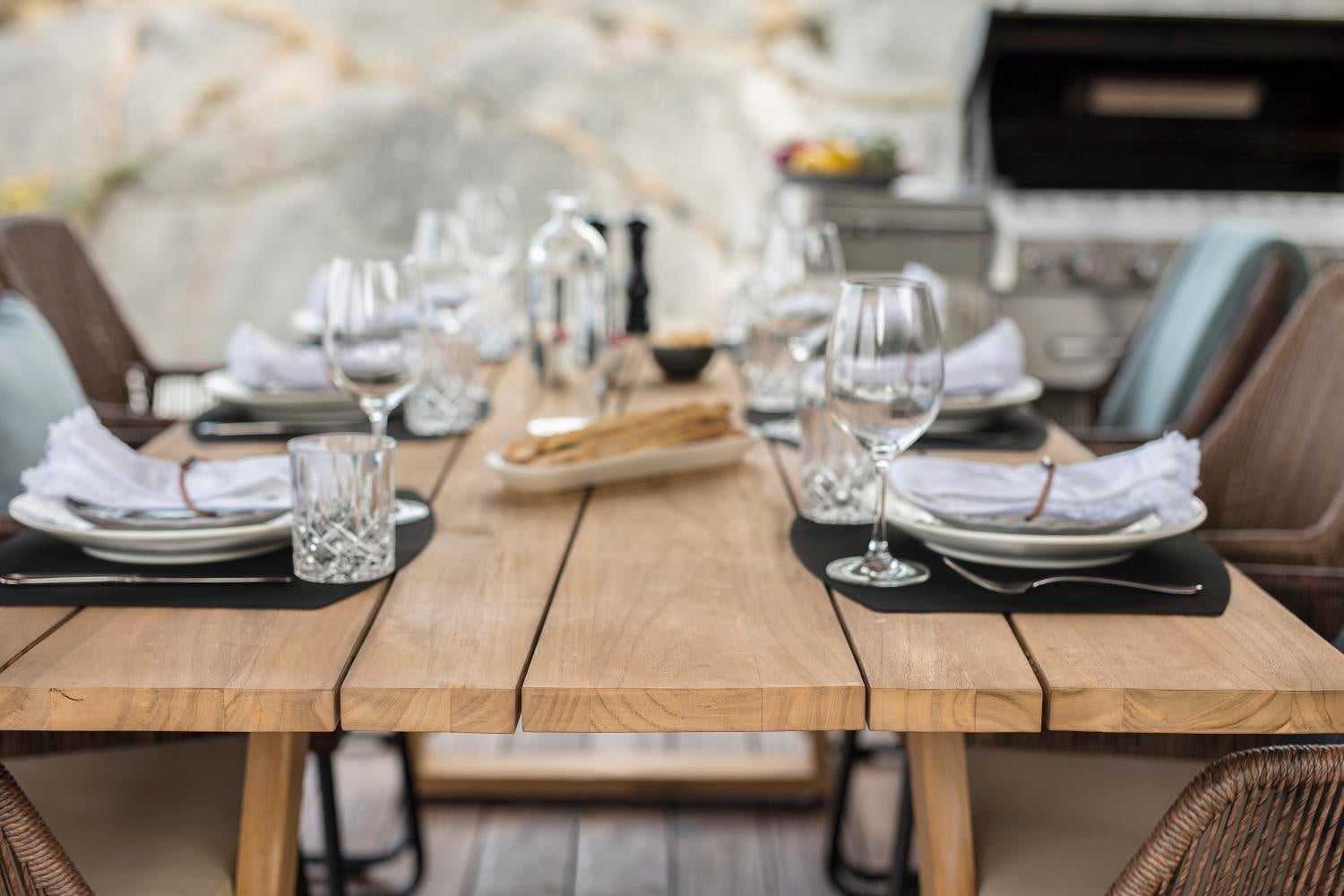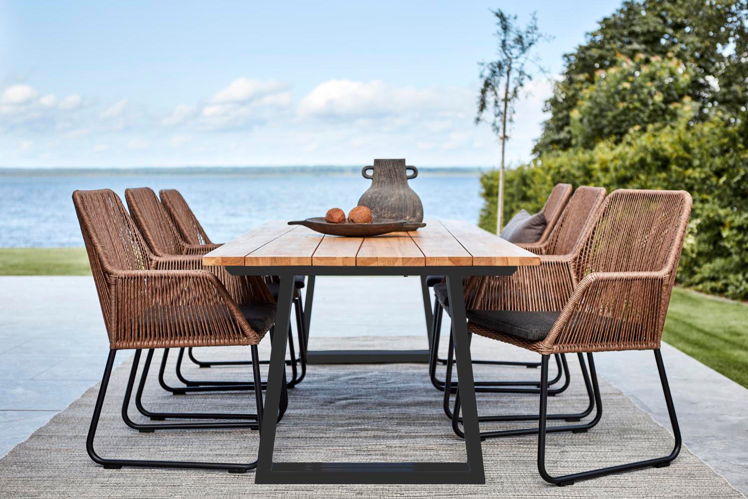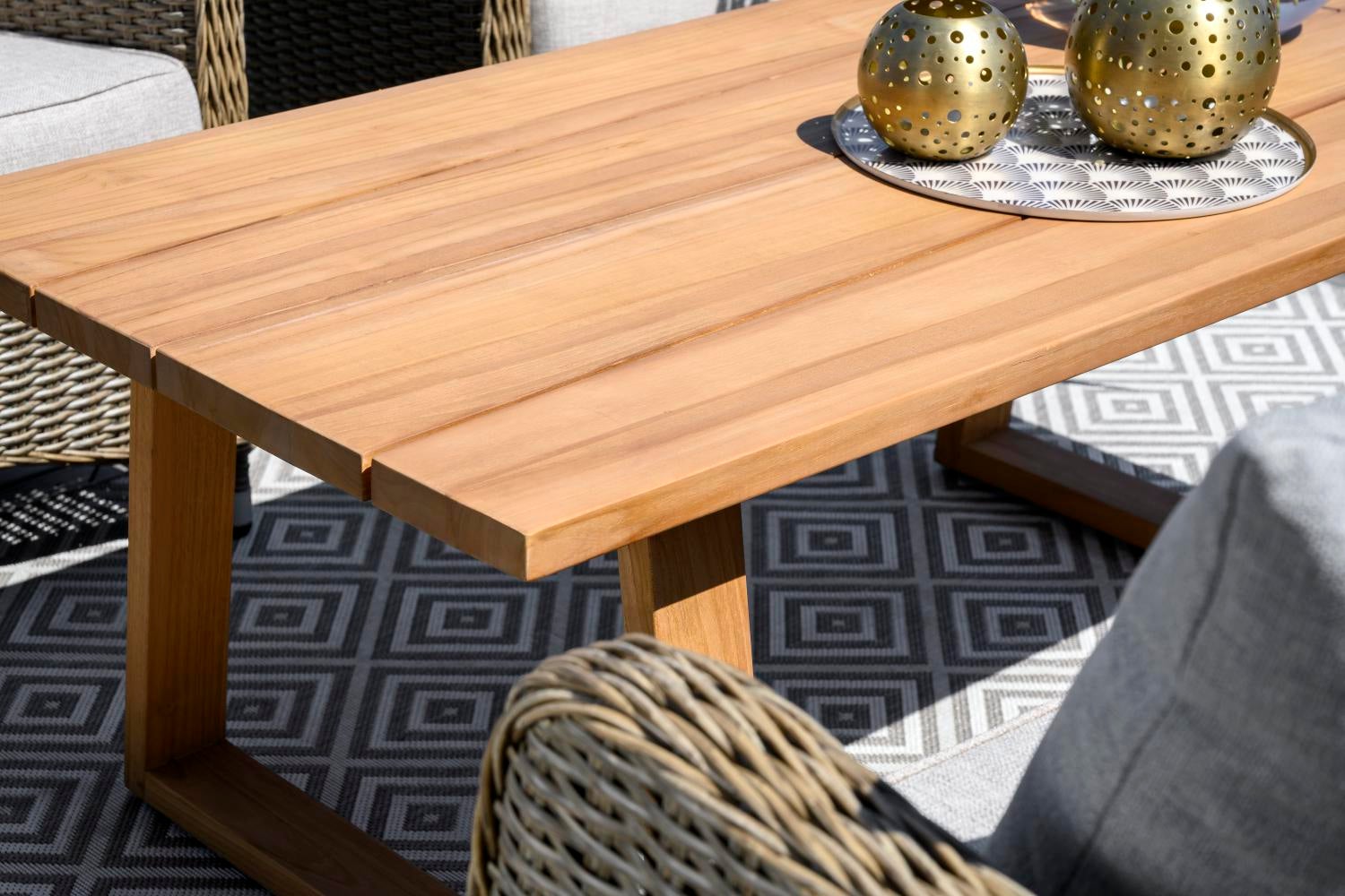 An attractive modern teak table characterised by a table top with a unique design and skilled craftsmanship. Versatile and generous.