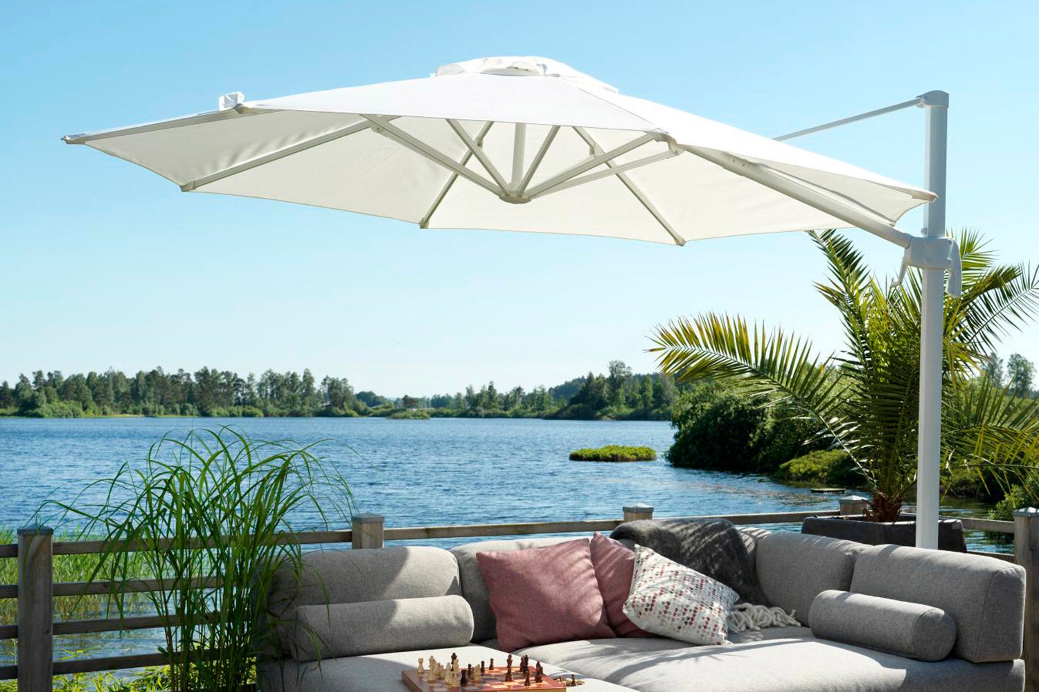 Linz is a free-hanging parasol in aluminum with a tilt function. The parasol can be tilted forwards and in rotation. The parasol canopy is made of 250 g polyester. Foot cross is included and it must be anchored with parasol foot weights or screwed into the ground. Parasol foot weights not included.