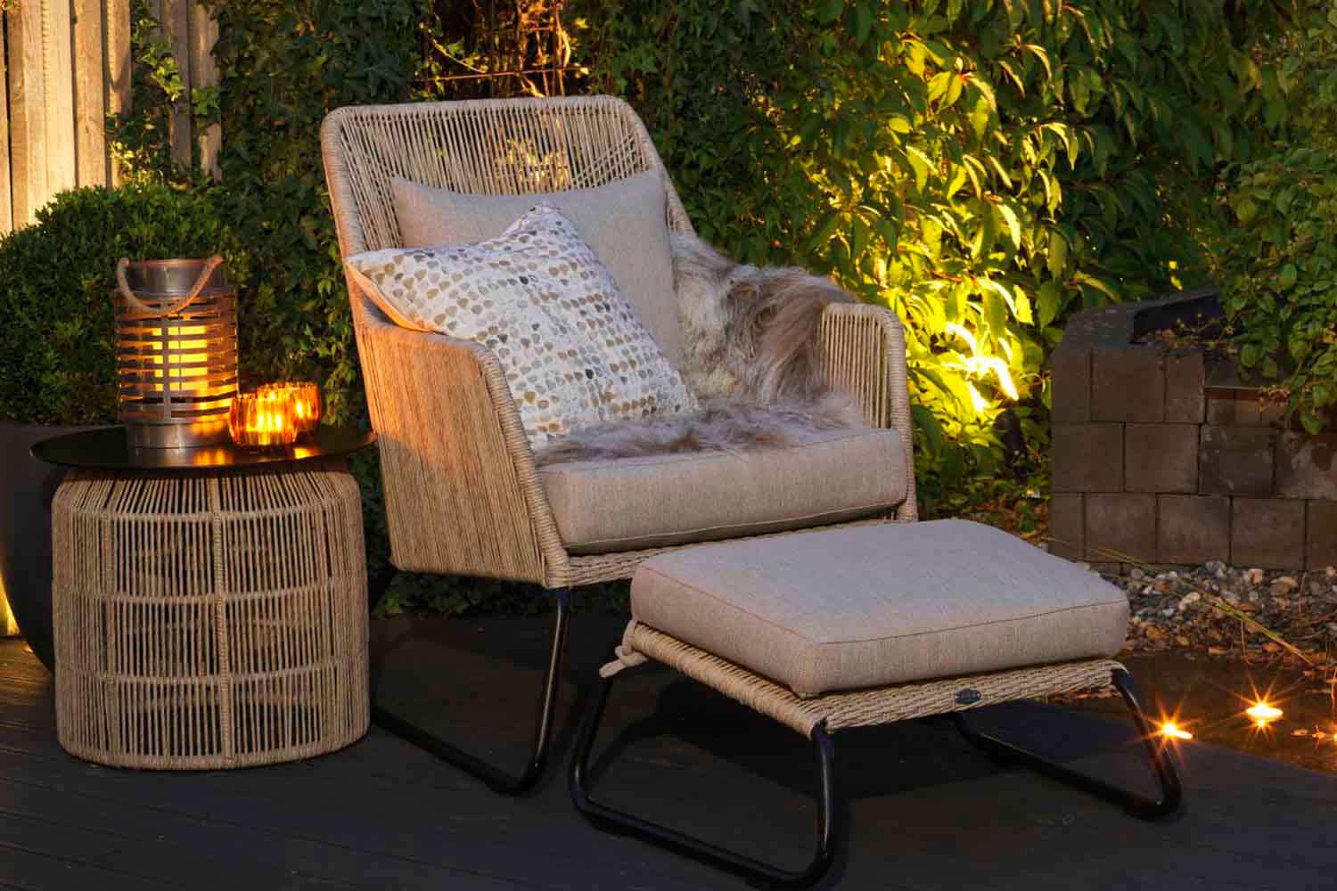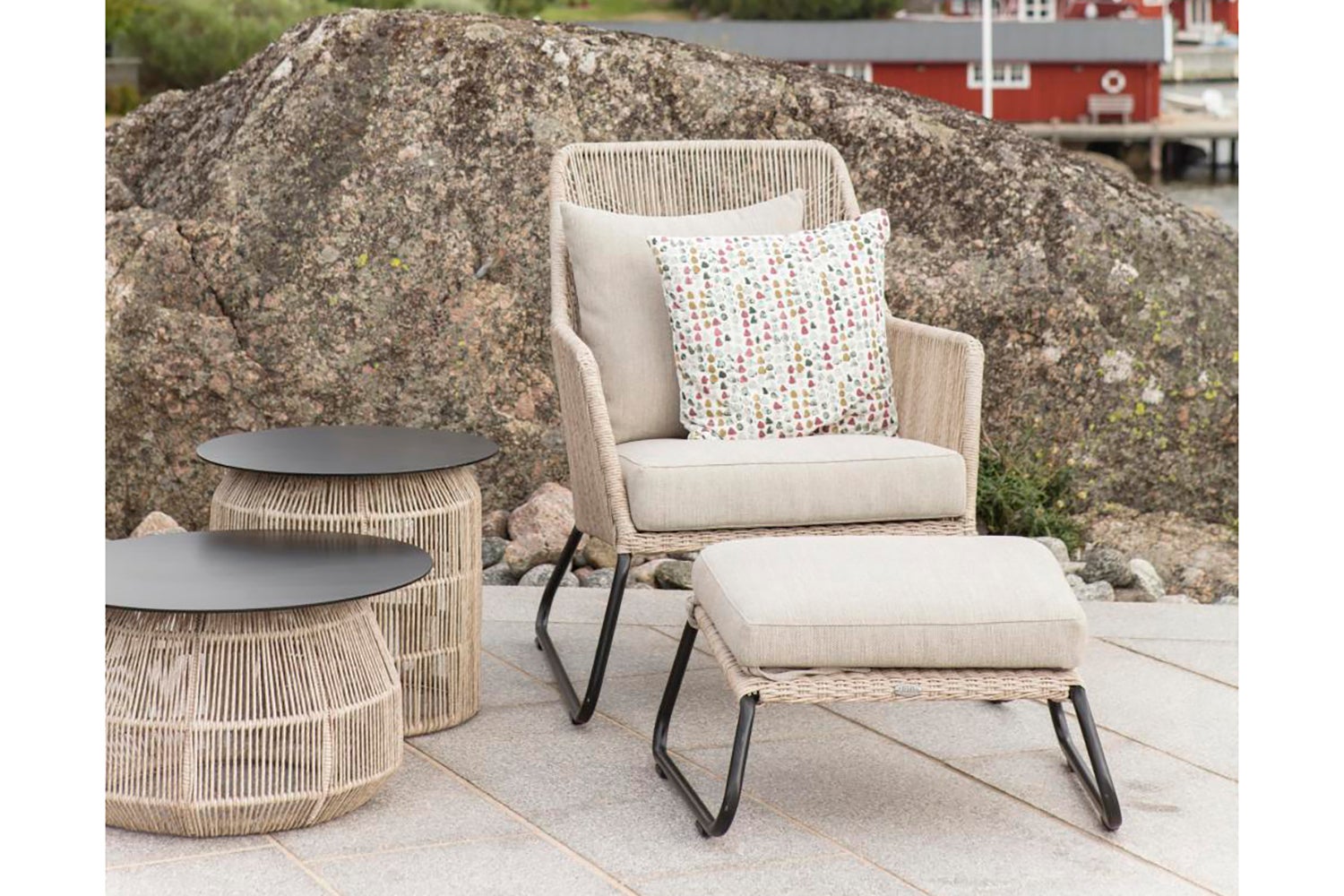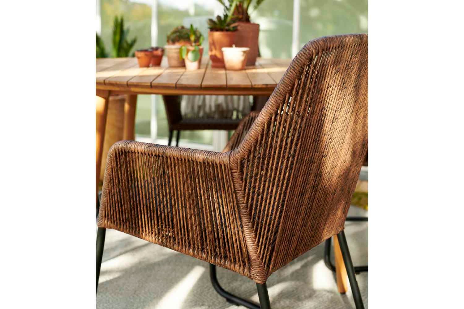 Midway is a series in twisted artificial rattan with soft modern shapes. All have aluminum frames and are hand-braided in synthetic rattan. The series includes a dining chair, armchair, footstool and bench. Sofas and chairs have cushions in olefin fabric. Available in two different colors.