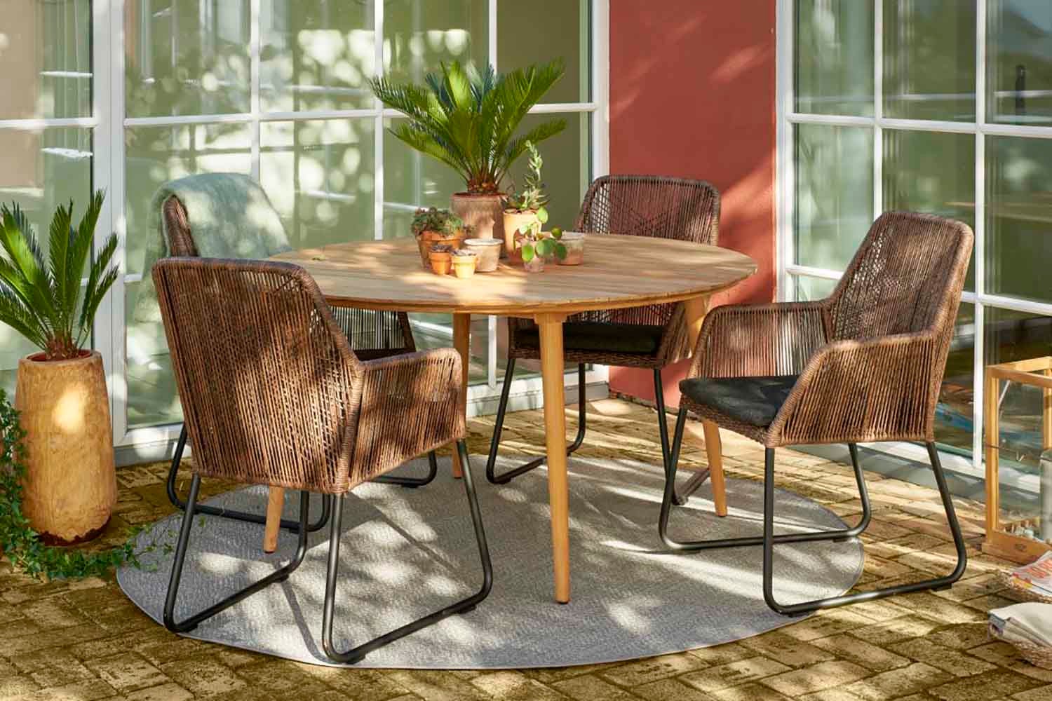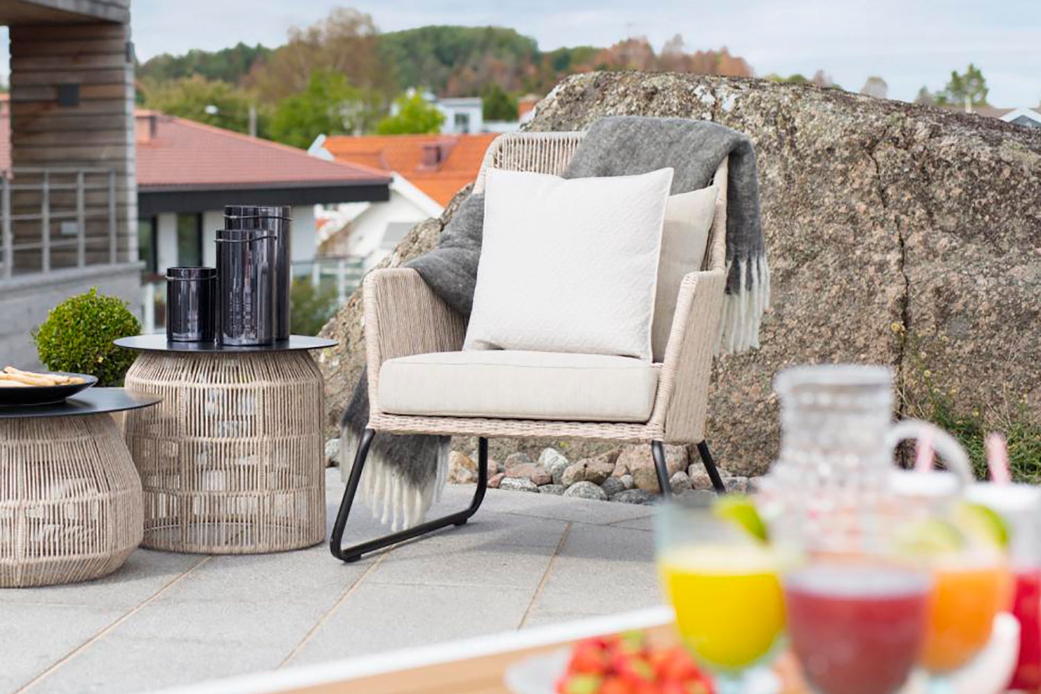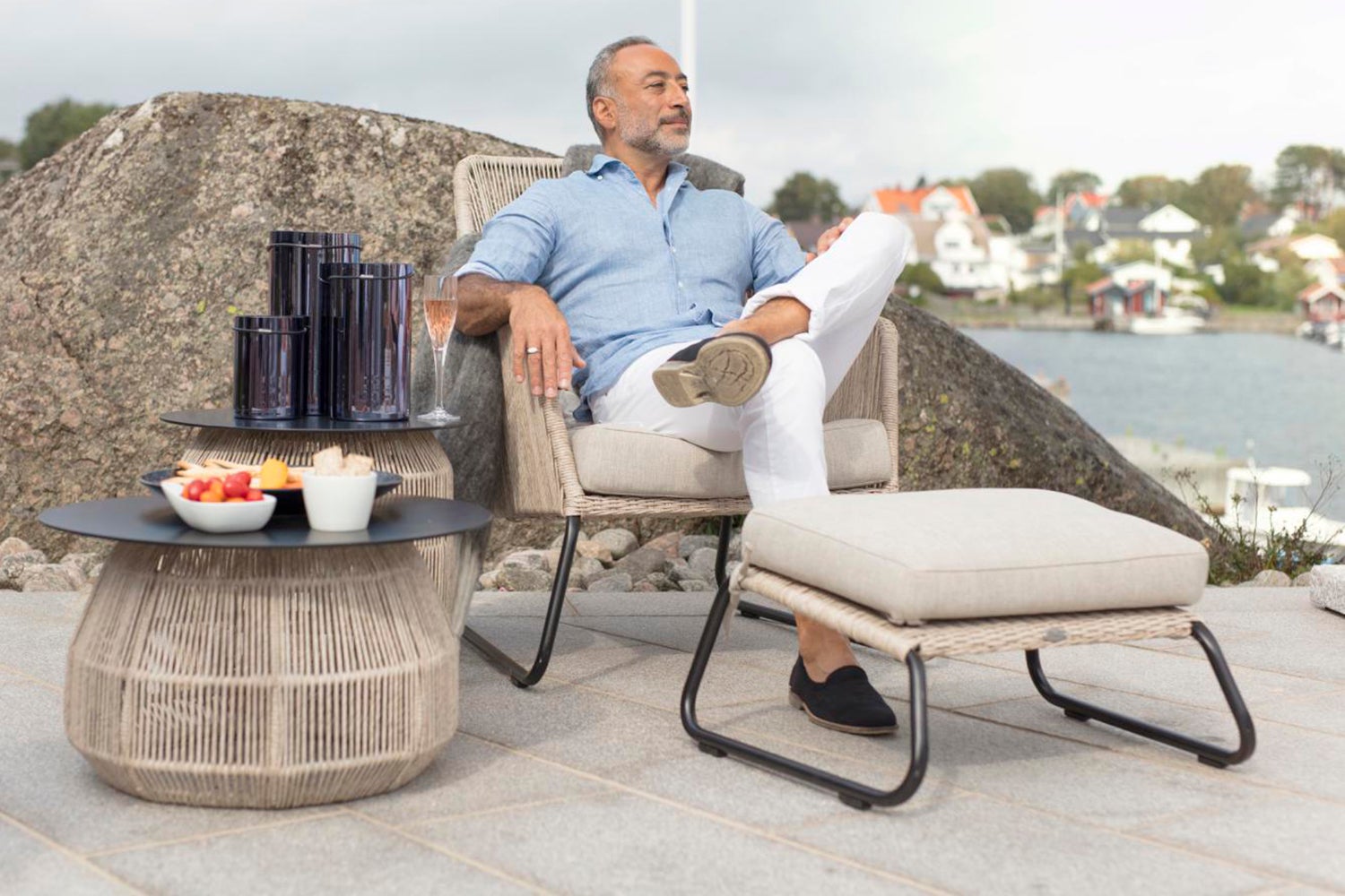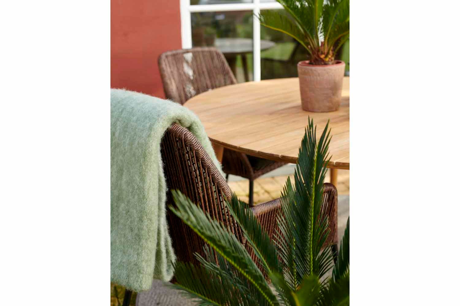 Midway is a series in twisted artificial rattan with soft modern shapes. All have aluminum frames and are hand-braided in synthetic rattan. The series includes a dining chair, armchair, footstool and bench. Sofas and chairs have cushions in olefin fabric. Available in two different colors.