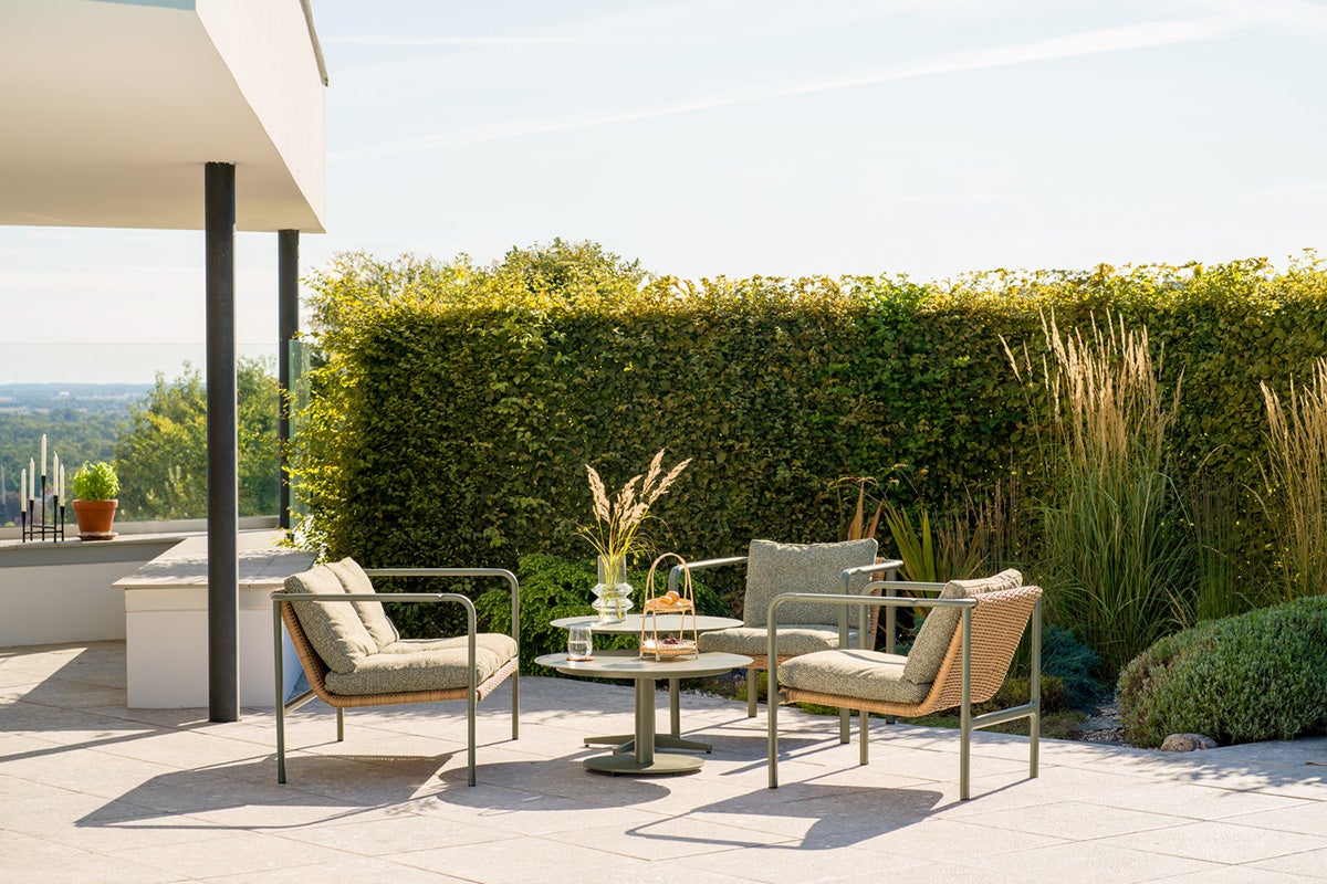 Soft shapes and a naturally inspired rattan look give Motty both comfort and style. The series is available in the colours Zin Red, Nordic Green and Black. The powder-coated frame has soft transitions at the joints and armrests, which enhances the elegant look. Soft Teddy fabric cushions complete the feel and make the Motty as inviting as it is comfortable.