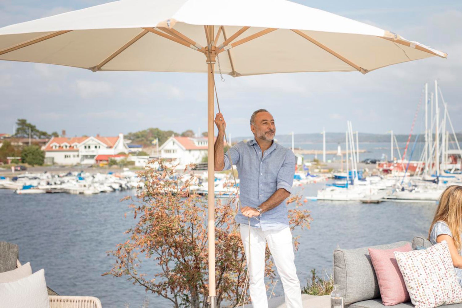 3,5 m parasol in FSC certified wood (beech) with varnished surface. Beautiful leather caps and weaving in 250g polyester.