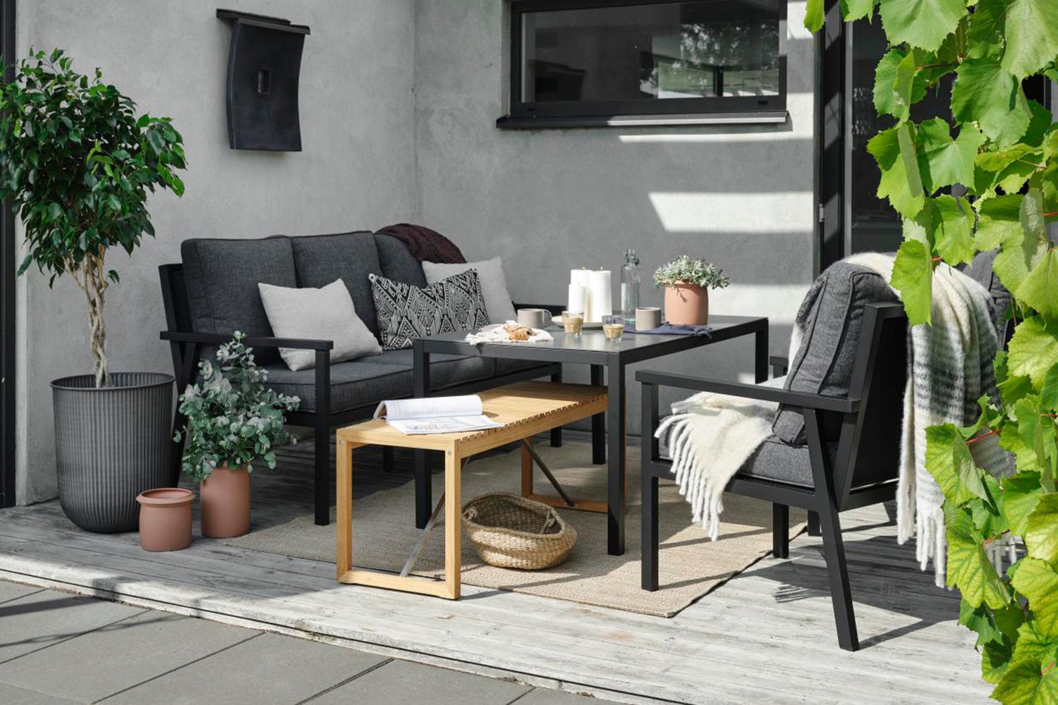 Rana is a series in aluminium, designed in a modern, relaxed style for a durable comfort. The perfecet combination of nice design, quality with an attractive price. Smart simplicity with few parts. Cushions in olefin fabric. Table tops in spray-painted glass. Anthracite textilen.