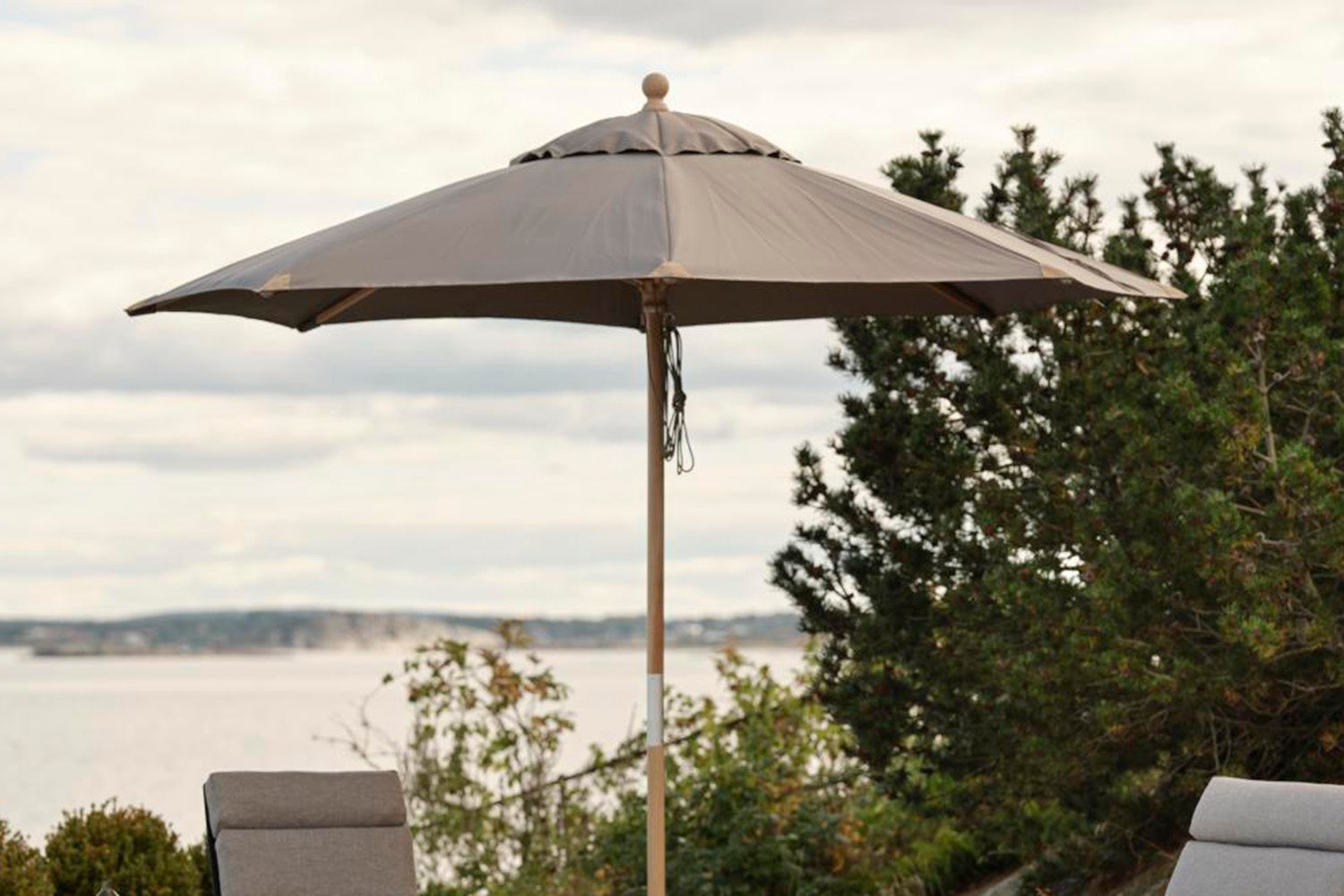 3 m parasol in wood (beech) with varnished surface. Two-piece pole. Beautiful leather caps and weaving in 250g polyester.