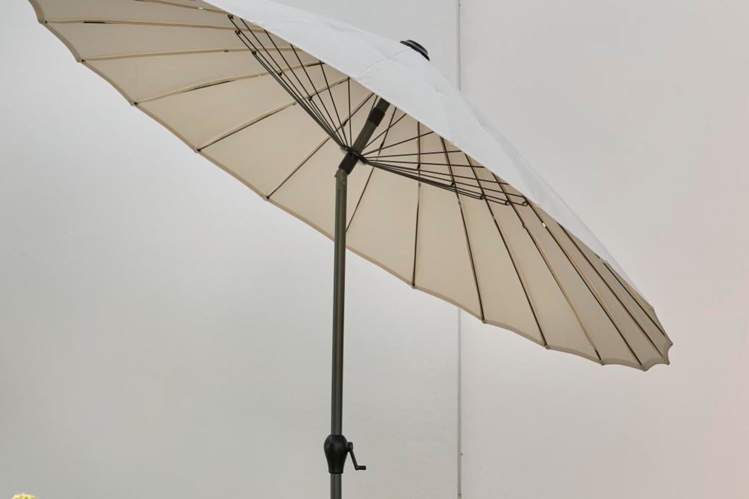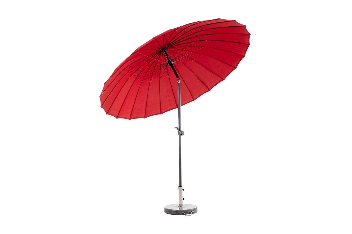 Shanghai is a modern parasol with a generous size and 50+ UPF protection against the sun's ultraviolet radiation. 2.7 meters in diameter creates protection from the sun where it is needed. The parasol has a solid crank and pole that can be tilted, making it easy to reach cooling shade. When it is angled, the many and beautiful steel ribs become visible - form and function in harmony. This parasol adds both style and function to your patio. Overall, all the features needed for a classic Shanghai parasol.