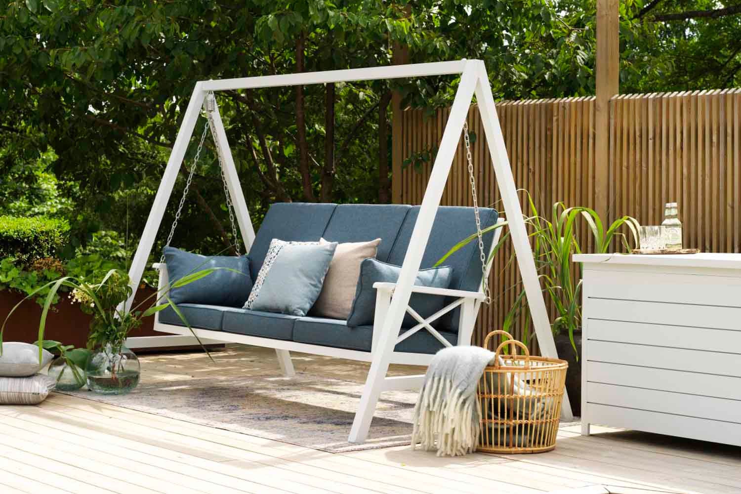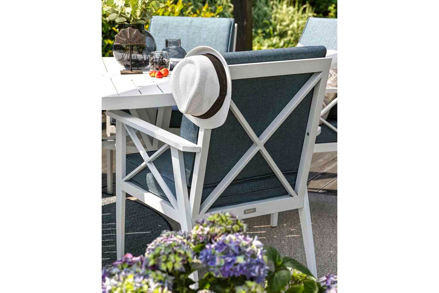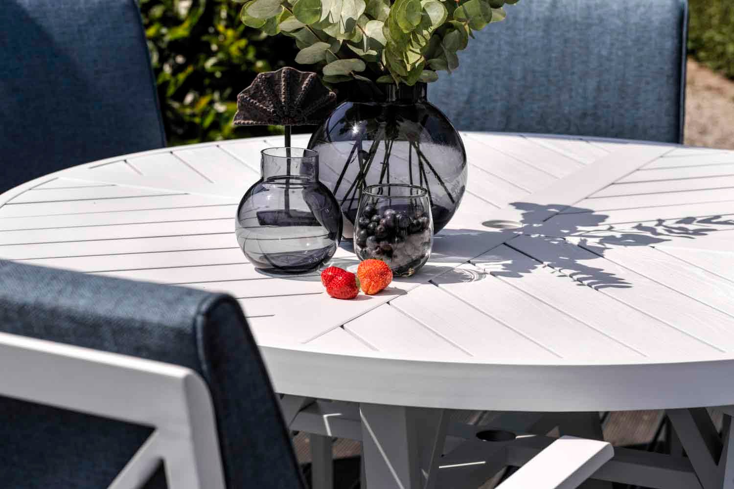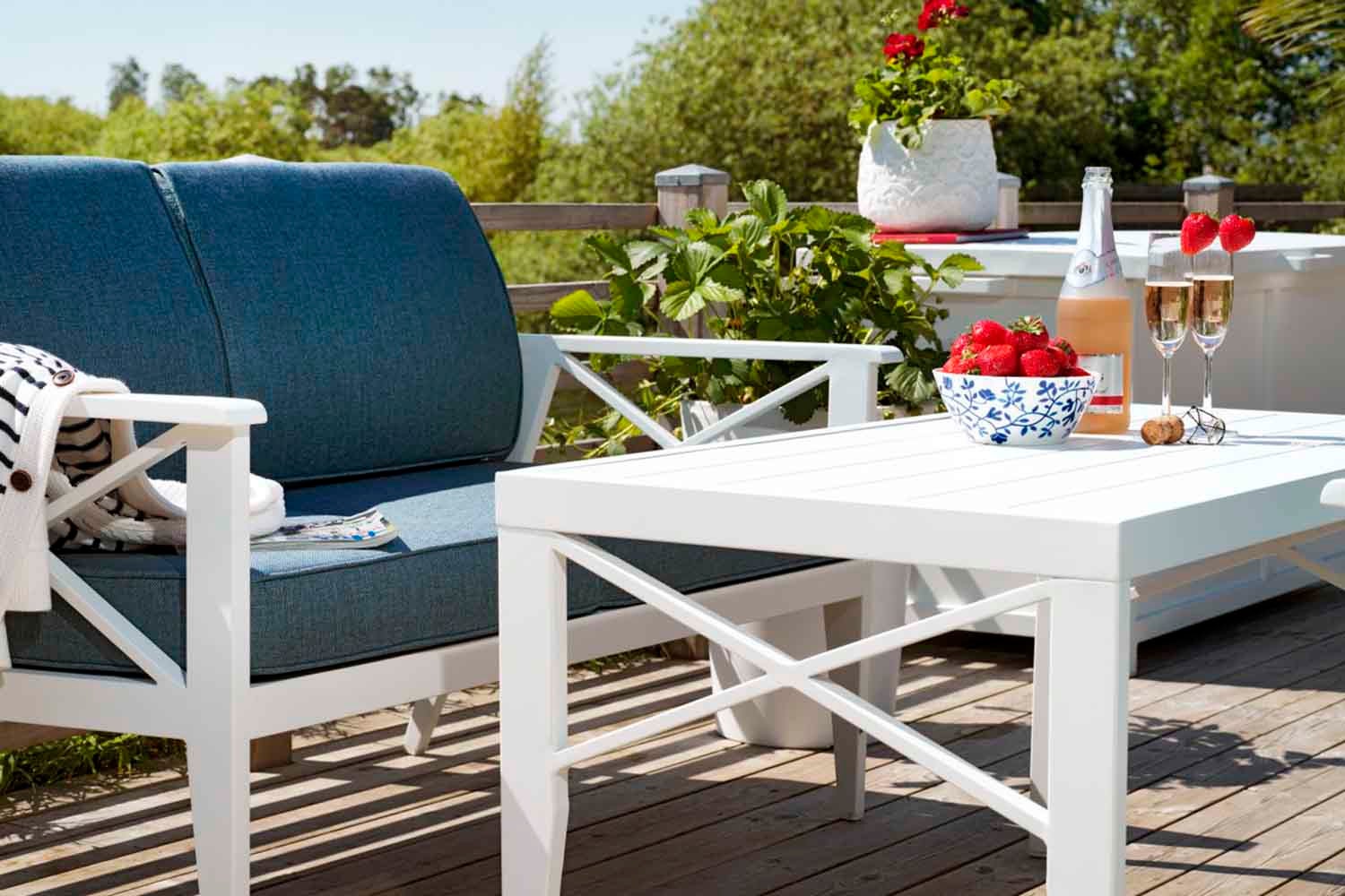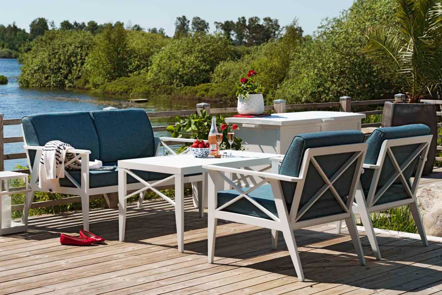 Classic design inspired by a timeless aesthetic and the unmistakable mood of the archipelago. White aluminium group with beautifully designed features like a cross in the backrest, tapered legs and olefin fabric. The cushions are designed with extra support at the back. The tables have embossed aluminium ribs on the top.