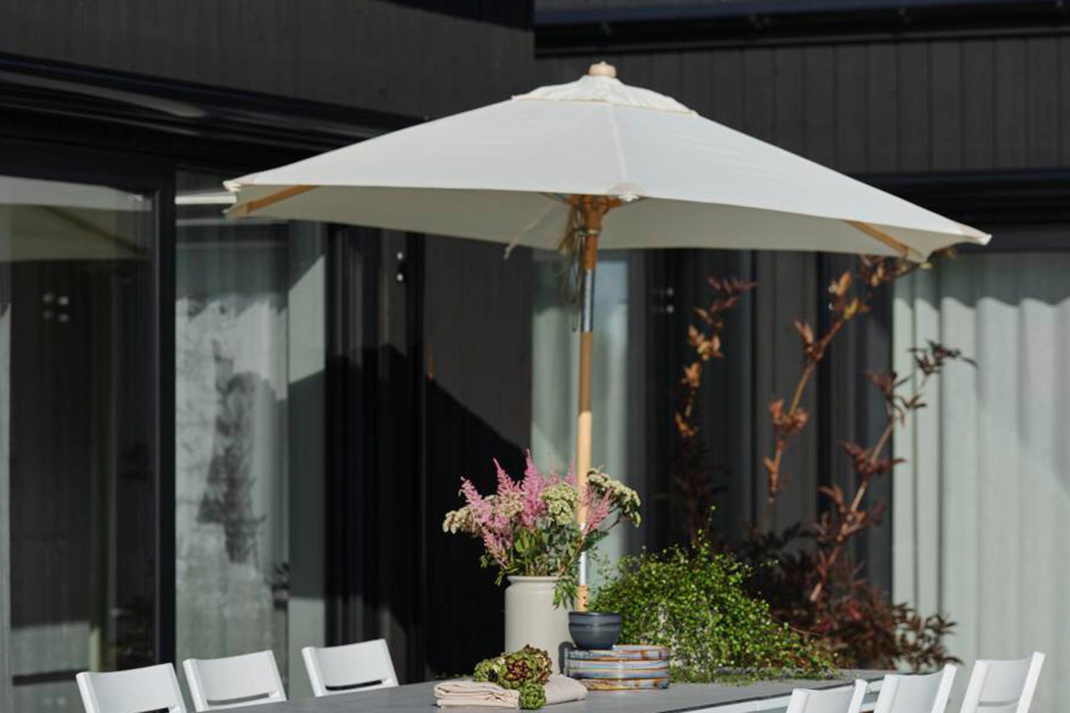 2.5 m parasol in wood (beech) with a matte varnished surface. Two-piece pole with a push tilt mechanism. Beautiful leather trim and 250 g polyester fabric.