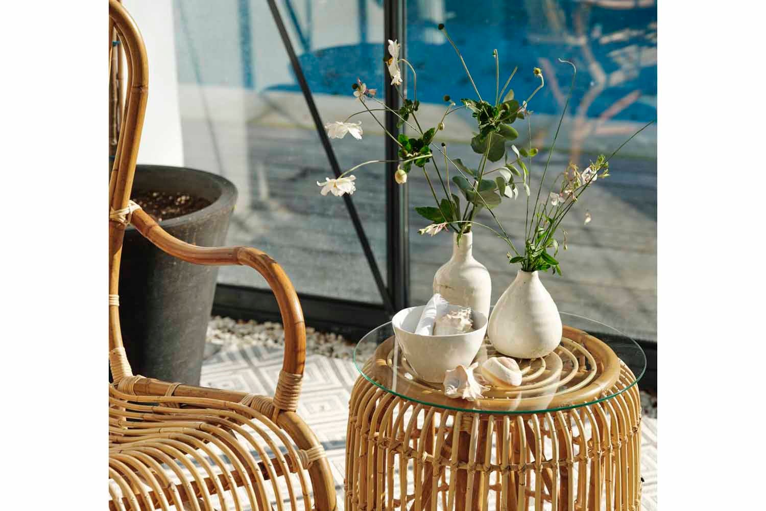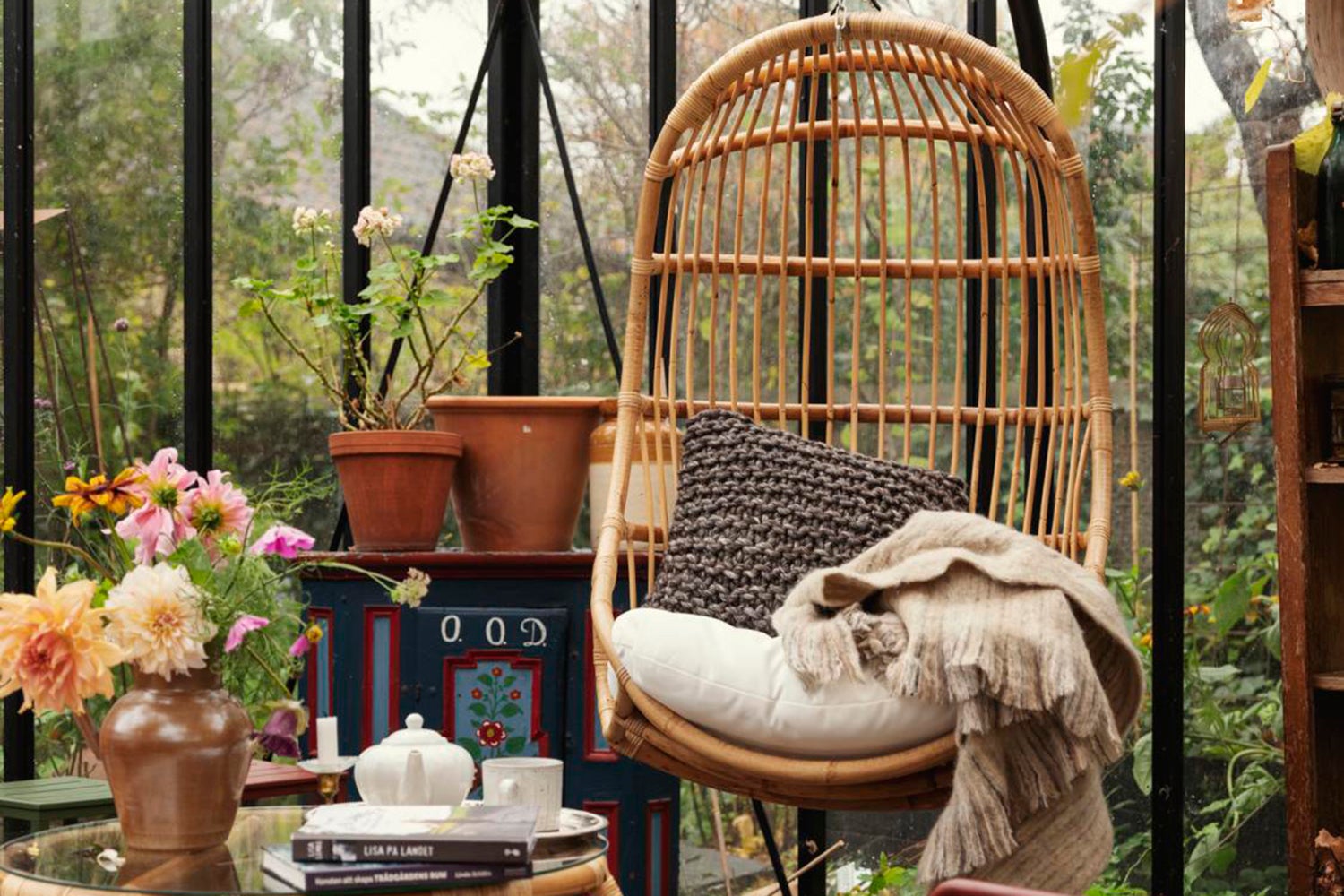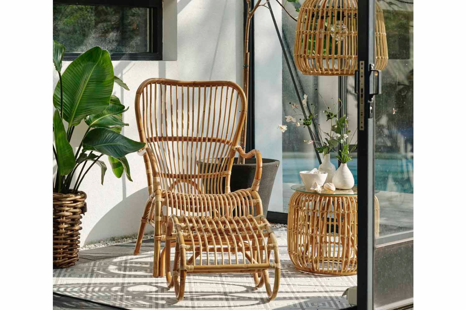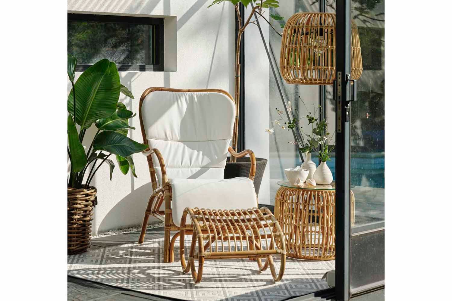 Vallda is a series of chairs, tables and a hanging swing in natural rattan with fine details. Natural rattan is braided rattan where the skin has been retained, which gives a more natural color and natural irregularities. Rattan furniture should be placed under a roof.