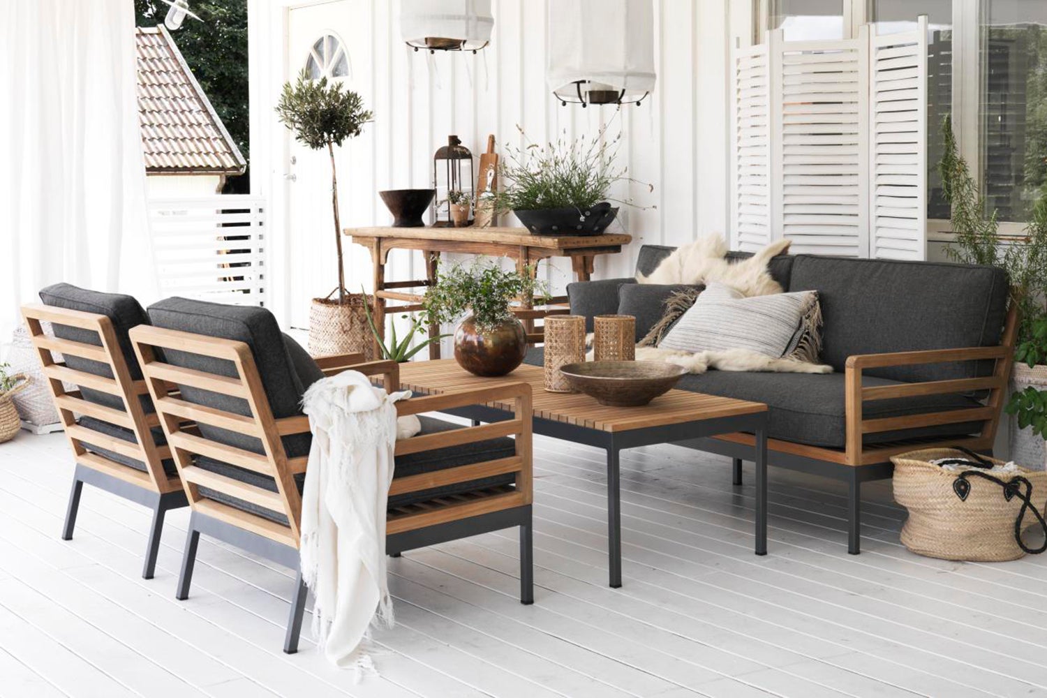Very sleek suite where high quality teak is combined with anthracite coated aluminum. The straight teak ribs enhances the impression of quality as well as elegance. Two cushions are included with the sofa and one cushion with each armchair.