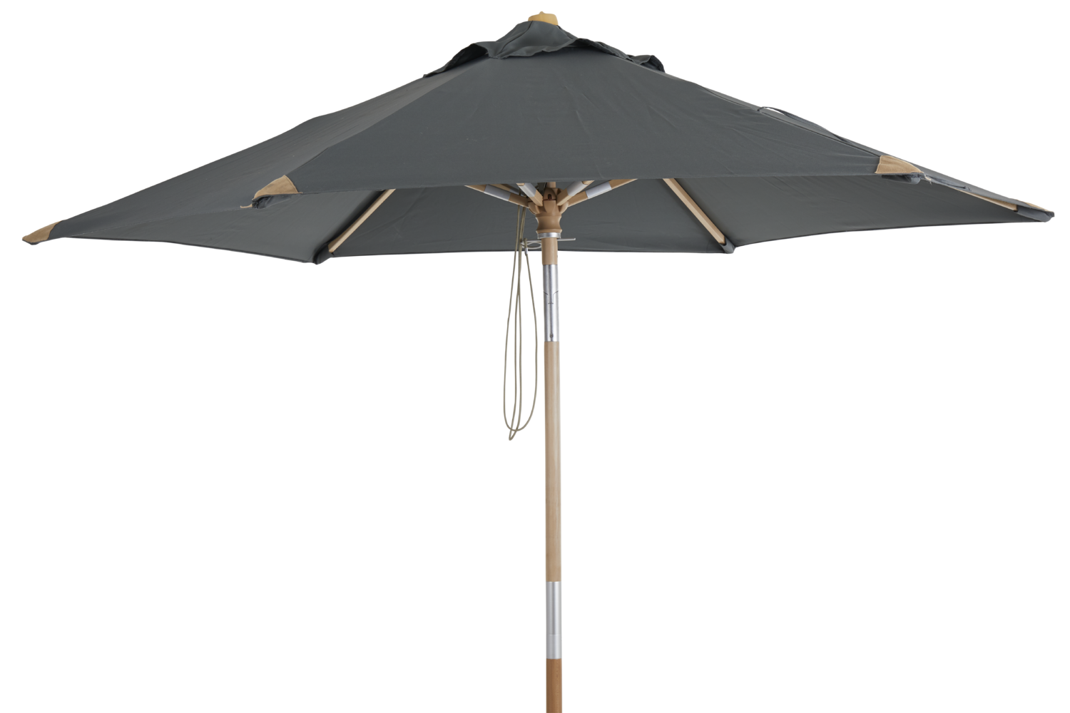 2.5 m parasol in wood (beech) with a matte varnished surface. Two-piece pole with a push tilt mechanism. Beautiful leather trim and 250 g polyester fabric.